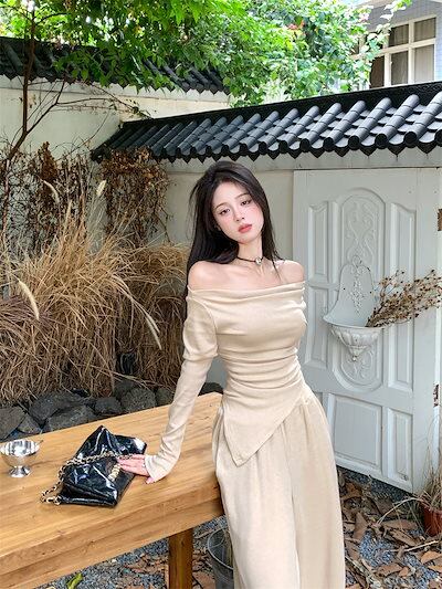 2024 秋冬 トップス 長袖 かわいいラウンドネック トレーナーTシャツ 肌見せ レディース ストレート韓国風ルーズゆったりカジュアルおしゃれサイズシルエットファッション系コーデ衣装上下セットアップ