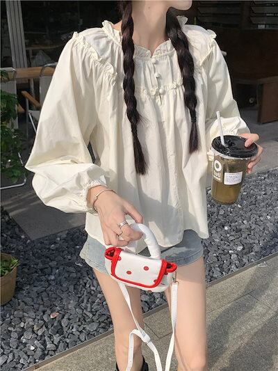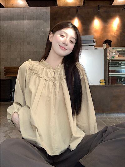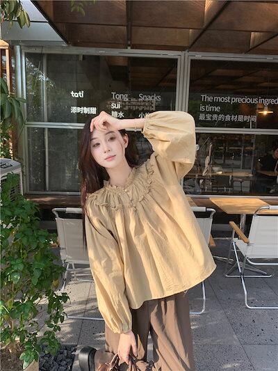 2024秋冬トップス シャツ 長袖 メロウネック ガーリー 甘め キュート 秋 白 茶色 おしゃれ かわいい きれいめ 大人っぽい 韓国ファッション レディース お出かけ