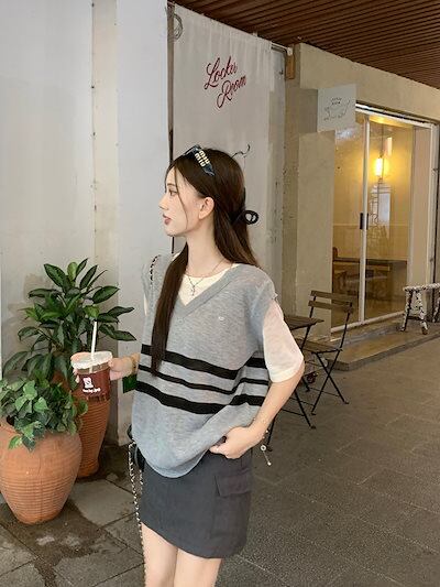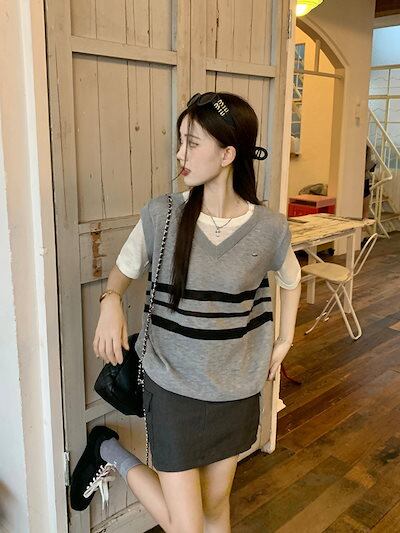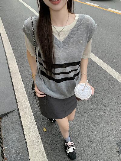 2024秋冬トップス ベスト ニット Vネック ボーダー 半袖 グレー 秋 ゆったり 韓国ファッション レディース おしゃれ かわいい カジュアル お出かけ