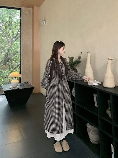 2024春夏ワンピース シャツ ロング丈 ボタン ラウンドネック ギンガムチェック 美脚効果 脚長効果 細見え 秋 黒 ブラック おしゃれ かわいい 韓国ファッション レディース お出かけ