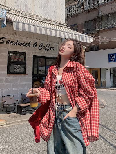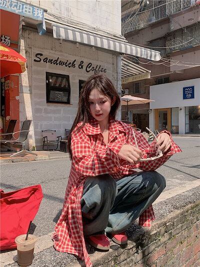 2024夏トップス シャツ 長袖 ボタン 襟 チェック柄 ゆったり 細見え 夏 赤 レッド おしゃれ かわいい 韓国ファッション レディース お出かけ