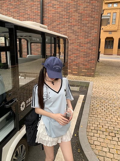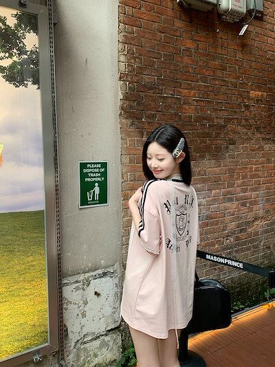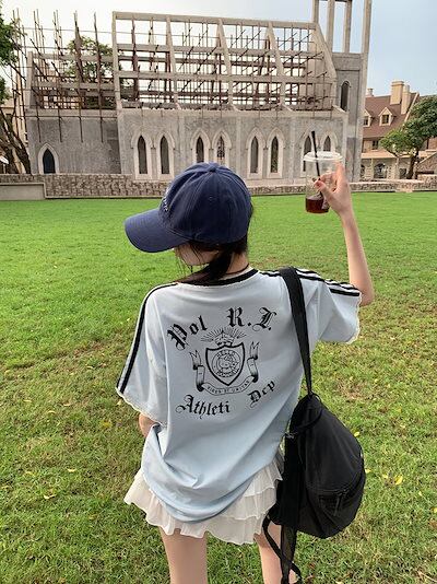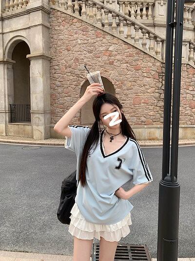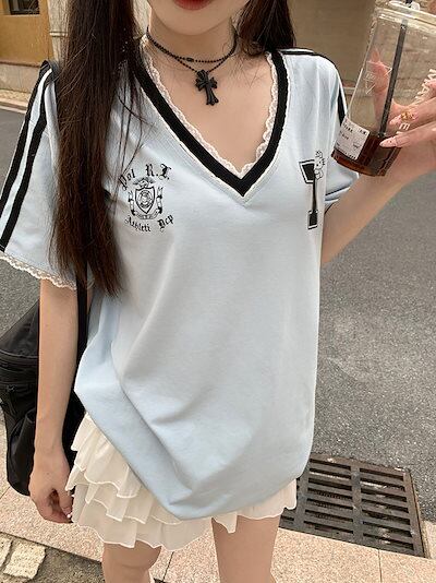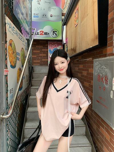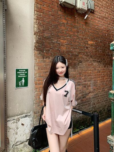 2024夏 韓国可愛い風トップス Tシャツ ファッション 半袖 スリムフィット ロングサイド ペイントシルエット ゆったり丈 休日レディースサイズ韓国Vネック おしゃれ カジュアル メンズライク T