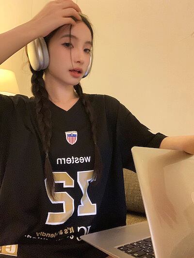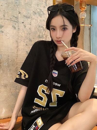2024 夏 韓国可愛い風トップス Tシャツ ファッション 半袖 スリムフィット サイドペイントシルエットゆったり丈 休日レディースサイズ韓国Vネック おしゃれ カジュアル メンズライクフットシャツ