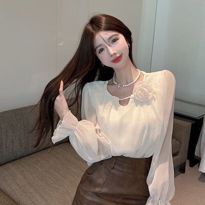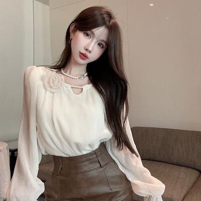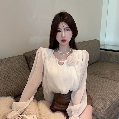今っぽシアーシャツ 長袖ブラウス 2024春新作 韓国ファッション パール ブラウス レディース シャツ 着痩せ Tシャツトップス ブラウスシアーシャツ ロングTシャツ tシャツ レディース