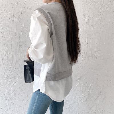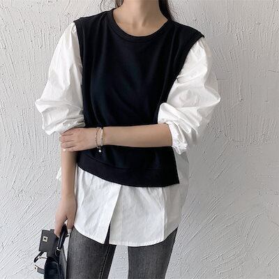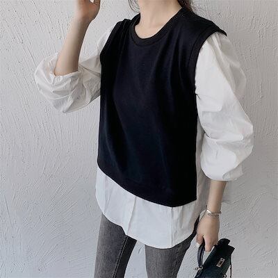 UVカット特集レディース ブラウス ニュースタイル 百掛け シンプル 長袖 切り替え カジュアル フェイクレイヤード 丸ネック シャツ 長袖ブラウス レイヤードトップスラウンドネックニット でもブラウ