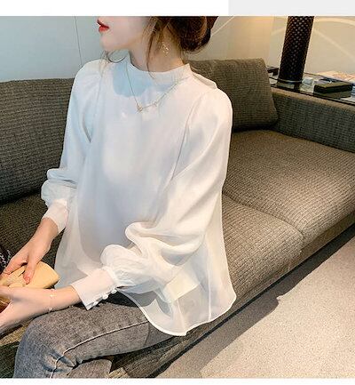 春新作 ブラウス レディース ボウタイブラウス ボウタイ リボンブラウス ボリューム袖 袖ギャザー ふんわり袖 長袖 大人 無地 個性的 体型カバー 春夏新作 おしゃれ パフスリーブ シフォンブラウス