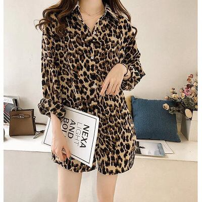 ブラウスデザインヒョウ柄長袖シャツレディース新作ヴィンテージミディアム丈シャツ