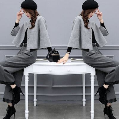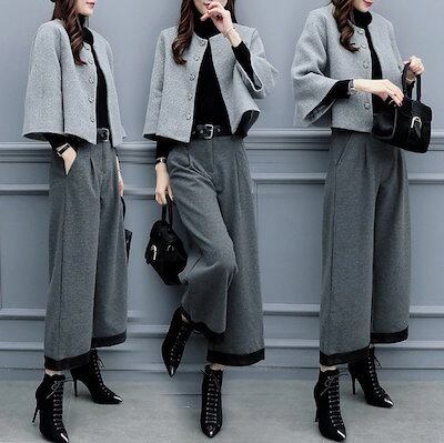 新しいレディーススーツ秋冬サイズ2点セットツイードコートワイドパンツカジュアルファッションスーツコート