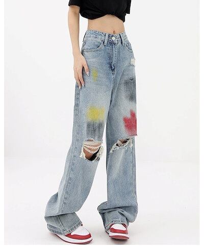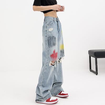 デニムボトムス ジーンズ 落書き青水洗 破穴ジーンズ ワイドパンツ モップストレートパンツ ボトムス レディース 美脚 デニムパンツ