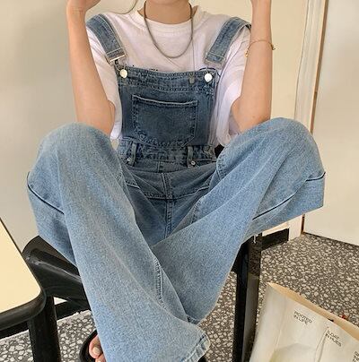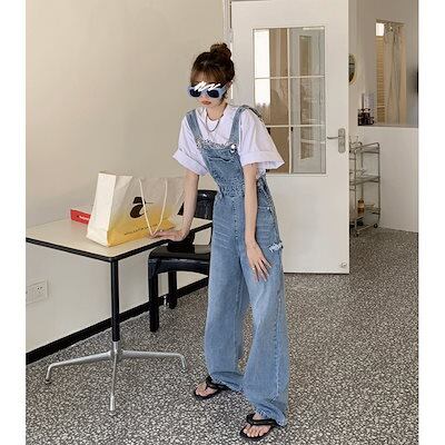 2025春服 韓国 減齢 ズボンのすそに穴が開いたカウボーイストラップモップ 長ズボン 女 コーデ完成 サロペット ワイドパンツ 韓国ファッション デニム