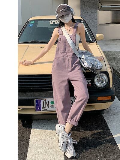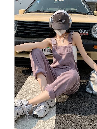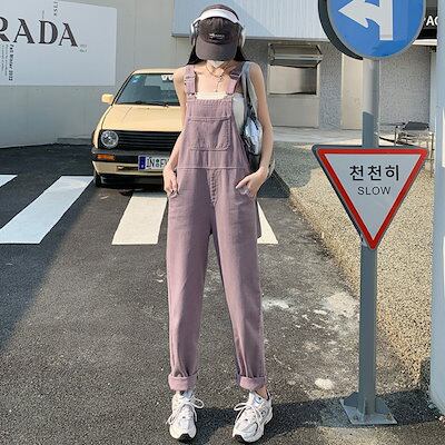 コーデ完成!サロペット デニム パープル 韓国ファッション 体型カバー ゆったり ストレートオールインワン サロペットパンツ ゆったり 無地 カジュアル ストレートワイドパンツ サロペット レディー