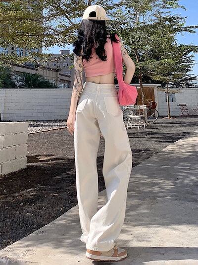 デニムボトムス ジーンズ ワイドパンツ レディース ホワイト レトロ 着痩せ ジーンズ ロングパンツ レディース服 デザイン感 ハイウェストゆったり 長ズボン ロングズボン ワイドパンツ モップパンツ