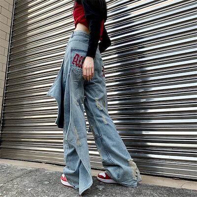 2024夏 韓国 4XL展開 ワイド デニムパンツ ボトムス ストレート パンツ ロゴ ズボン ファッション系加工韓国 レディース カジュアル パッチワーク 学生 スタイルアップ 色っぽ 女っぽ