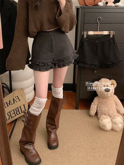 韓国ファッションショートパンツ 防寒パンツシンプル ショート丈 ハイウエストショートパンツ 脚長 美脚細見え百掛けパンツ レディース