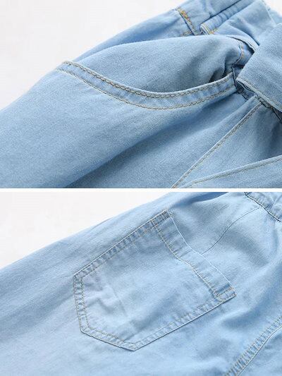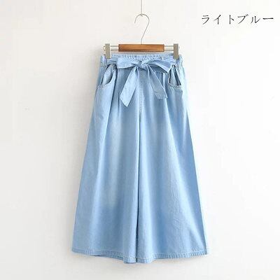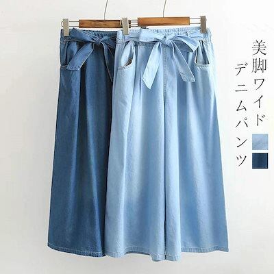 デニムパンツ レディース ウエストゴム ワイドパンツ デニム きれいめ パンツ 春 夏 薄手 ボトムス ハイウエスト ワイドデニムパンツ リボン付き ロングパンツ ジーンズ ロング ストレートパンツ