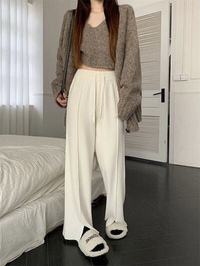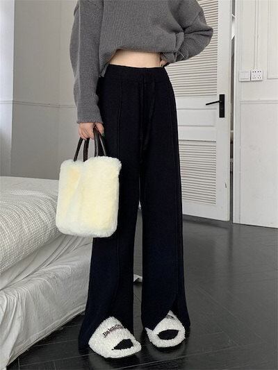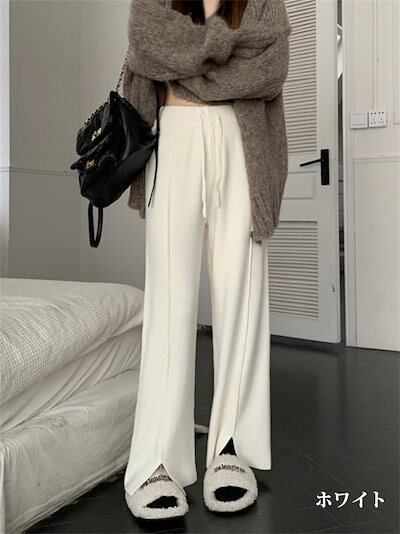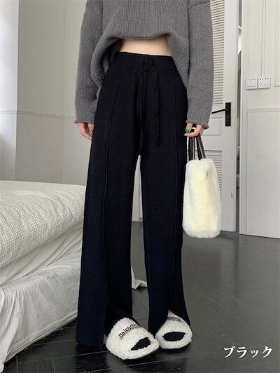 ワイドパンツ レディース きれいめ パンツ リブニット フレア スリット ボトムス ロング 秋冬 ストレートパンツ パンツ ワイド ストレート フレアパンツ リブ ハイウエスト ウエストゴム 紐付き
