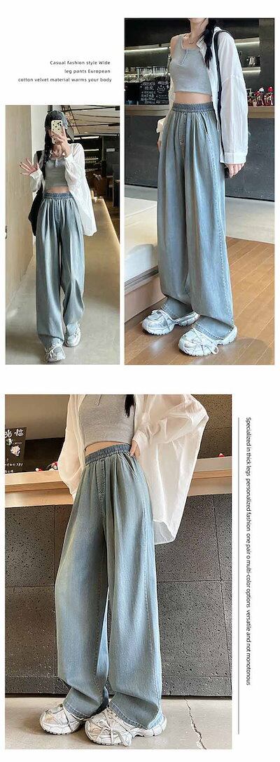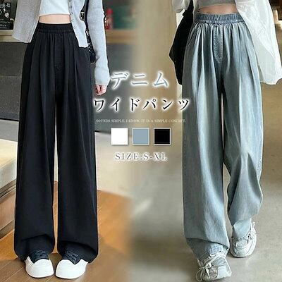デニムワイドパンツ レディース ストレートパンツ デニム ワイド パンツ 春夏秋 タックパンツ ウエストゴム ジーパン ロング丈 ボトムス リラックス ゆったり 楽ちん おしゃれ 体型カバー ブルー