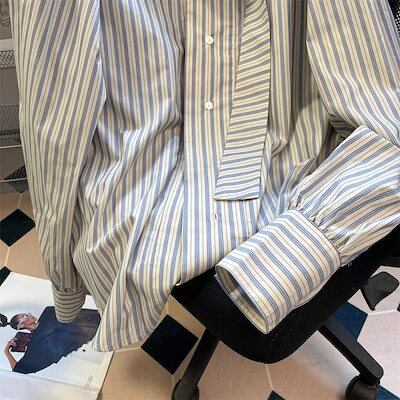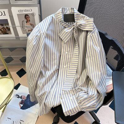 蝶ネクタイ ネクタイ 縦ストライプ シャツ レディース 秋 デザイン ニッチ 重ね着 ゆったり シャツ ロング 韓国ファッション