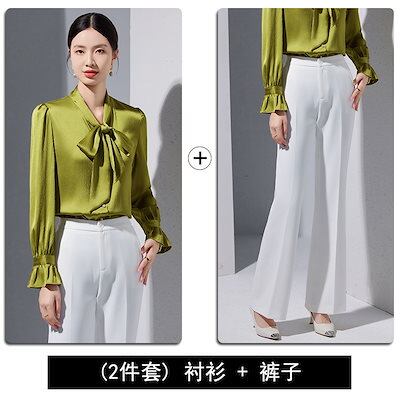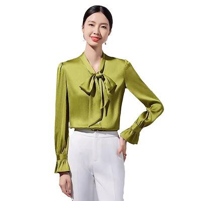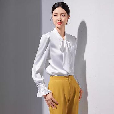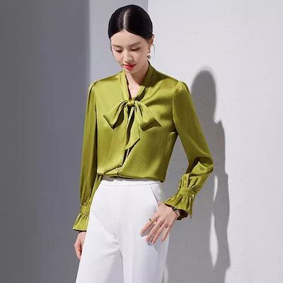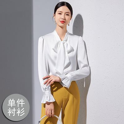 アセテートサテン 長袖 シャツ レディース シニア感覚 新作 キャリア ファッショナブル レースアップ 蝶ネクタイ シャツ 韓国ファッション