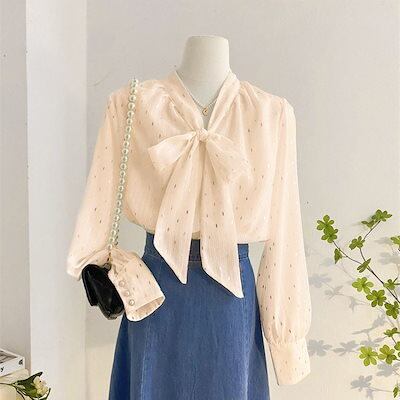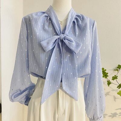 フレンチ 高級感 鮮やかなシルク ゆったり ブラウス レディース ニッチ バーサタイル ブルー レースアップ 蝶ネクタイ ロングスリーブ トップス 韓国ファッション