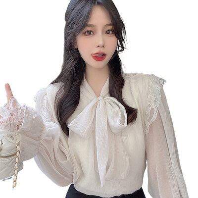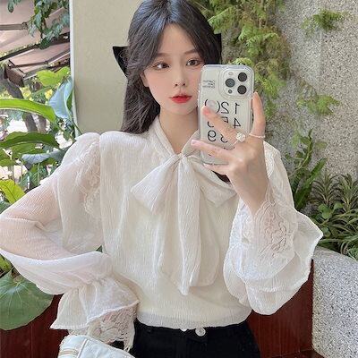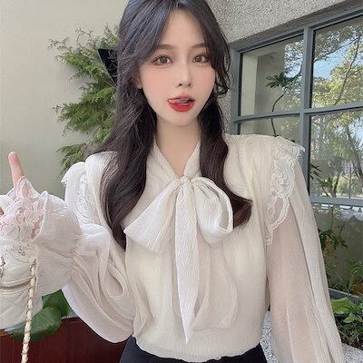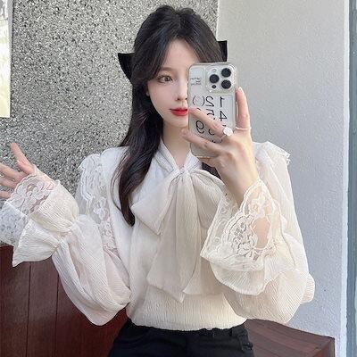 韓国 秋冬 フランス ニッチ レース パッチワーク フリル 蝶ネクタイ レース デザイン ロングスリーブ ブラウス トップス レディースウェア 韓国ファッション