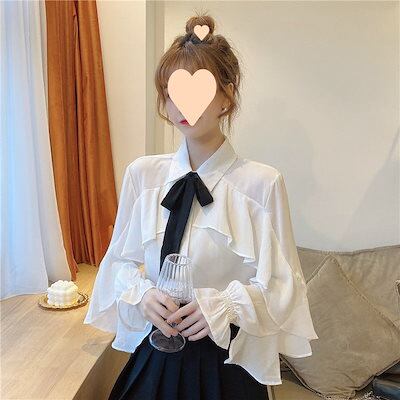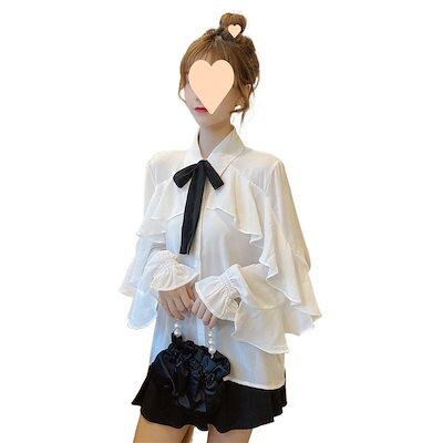 春秋 新作スタイル 蝶ネクタイ シャツ レース フレアスリーブ フリルエッジ 気質 シフォン ファッショナブル 白シャツ レディース 韓国ファッション