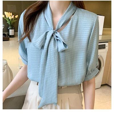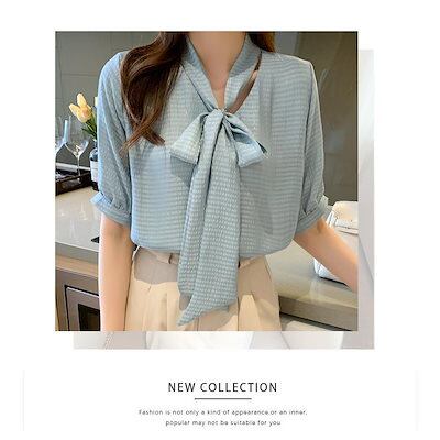 春夏新作 通勤 レディース 白シフォンシャツ 大人 ゆったり 五分袖トップス リボンネック上品 シャツ オシャレブラウス ブラウス