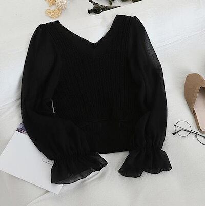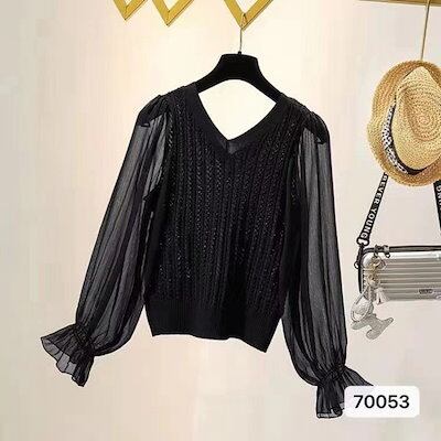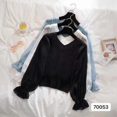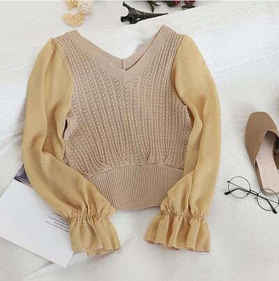 ニットトップス ニットブラウス vネック ニットソー ぽわん袖 フリル袖 シースルー 異素材切替 トップス きれいめ ケーブル編み