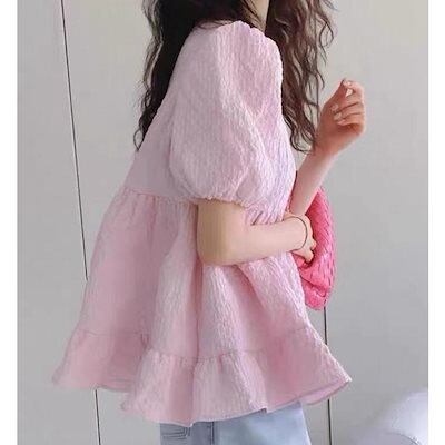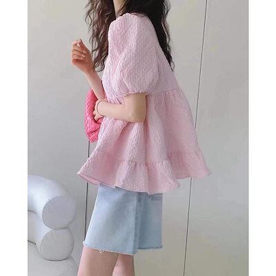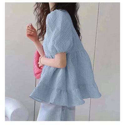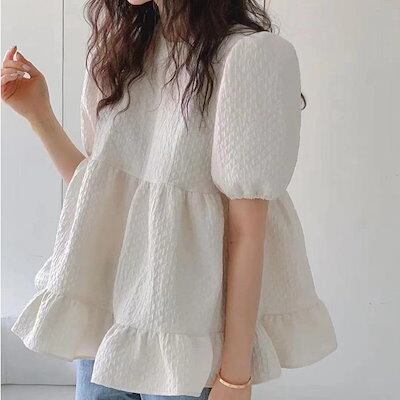 ジャガードブラウス エンボス加工 Aライン 裾フリル ブラウス バルーン袖 半袖 無地 トップス 春 夏 レディース フレア