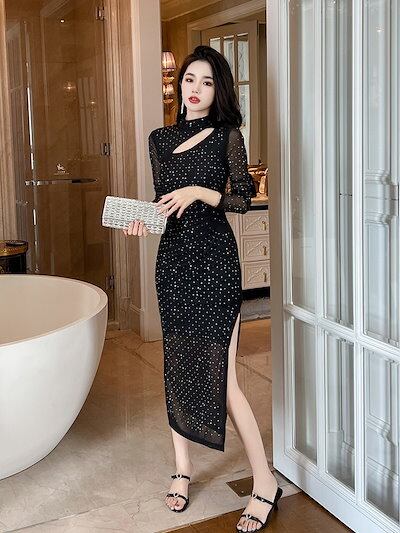 【JY.上品】 秋 キラキラ ロングワンピース フランス風 スリット チャイナドレス チュール パーティードレス キャバ 着痩せ 大人 同窓会 披露宴 卒業式 結婚式 演奏会 ウェディング 二次会