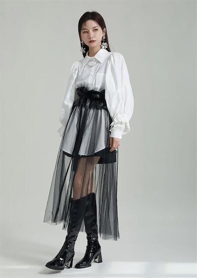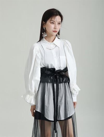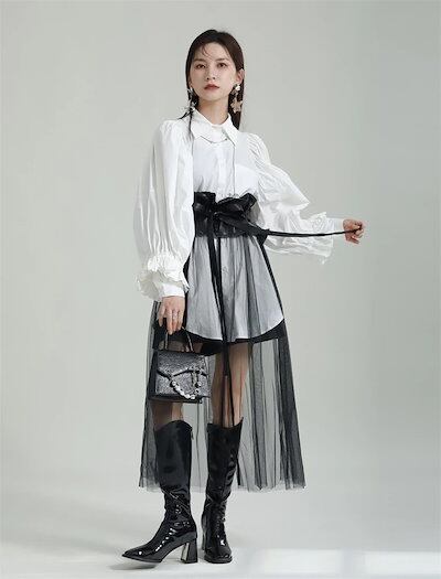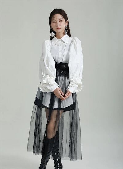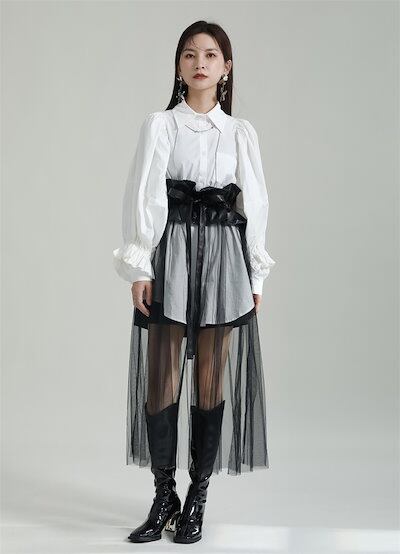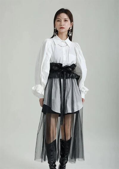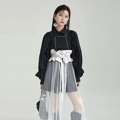 【J.Fashion】 シルクスカート PUバンド ウエストバンド+チュールスカート 一体式飾りベルト ペプラムスカート ドッキングスカート スカート「ブラウスは店で購入可能」 メガ割