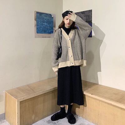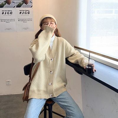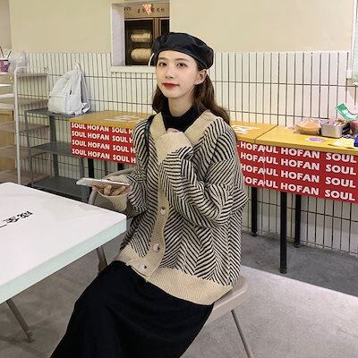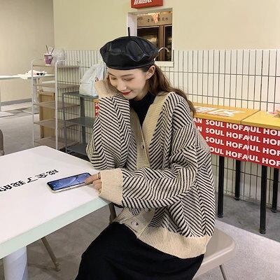 ベーシックニットニットカーディガン 新作ニットカーディガンコート女ゆとり学生のボーダートップスセーター