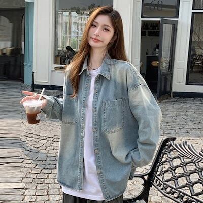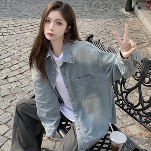 2025韓国 デニムジャケット レディース レトロなデニムシャツコート女性長袖アウターミディアムブラウス トップス アウター