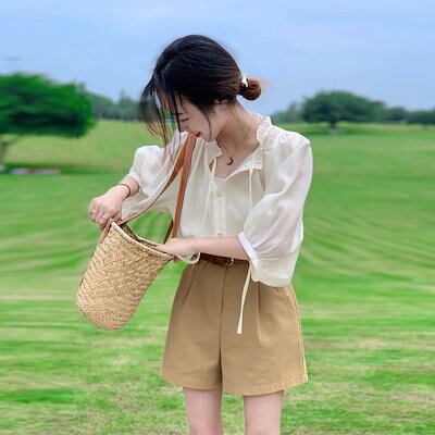 今っぽシアーシャツ 2025年新作春先フレンチ半袖シャツシフォンブラウスブラウスショートパンツ夏服2点セット 韓国 ブラウス レディースファッション オフィス カーディガン