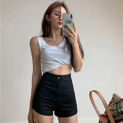 【人気商品】黒の細いハイウエストショーツ女性夏スキニーデニムショーツ