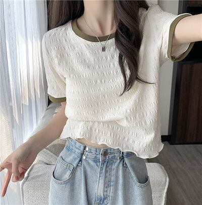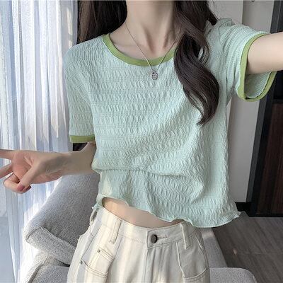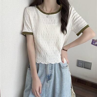 Tシャツ 正肩 半袖 2024夏服 トップス スリム見え ins ショート丈 レディース 韓国ファッション