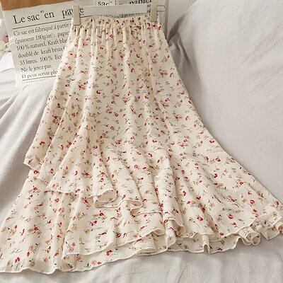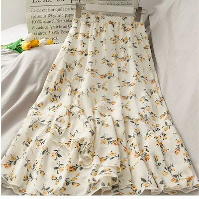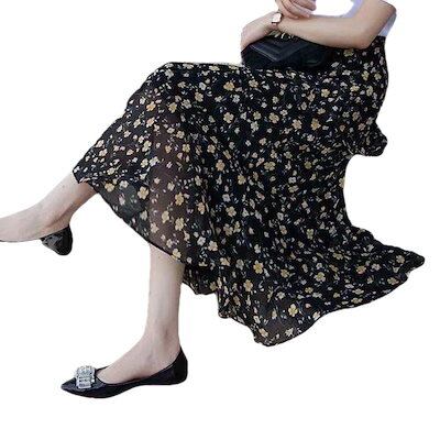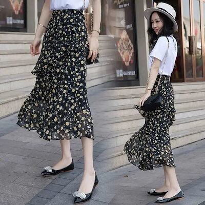 プリーツスカート 韓国 シフォン 春夏 ミディアム 新作 花柄 半身スカート ハイウエストで痩せ見え 不規則なフリル ロングスカート マキシスカート レディース