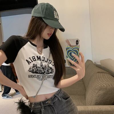 Tシャツ Vネック 半袖 夏 2024新型 アメリカンレトロデザイン感ショート丈 学生 トップス レディース 韓国ファッション