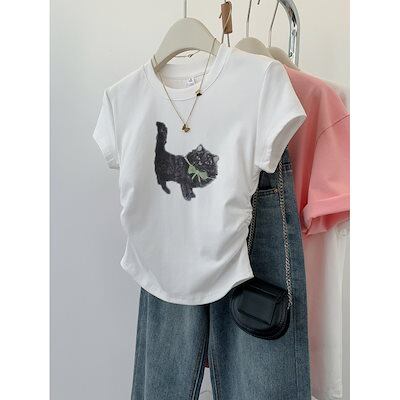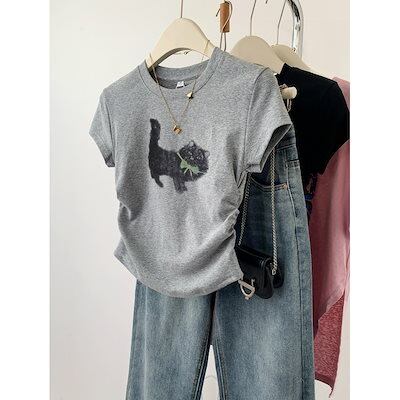 Tシャツ トップス グレー 猫ポジティブ 半袖 夏 2024新 しいスリム薄いショートセクション レディース 韓国ファッション