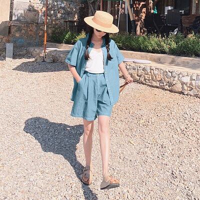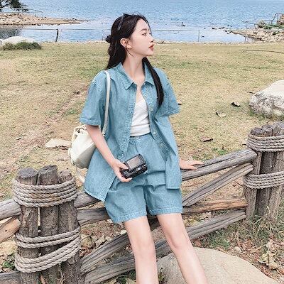 2024 夏 新作 デニムファッションスーツ半袖シャツワイドパンツ2点セット 百掛け 韓国ファッション 涼しく楽ちんセットアップ レディース