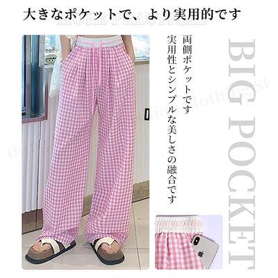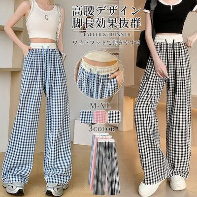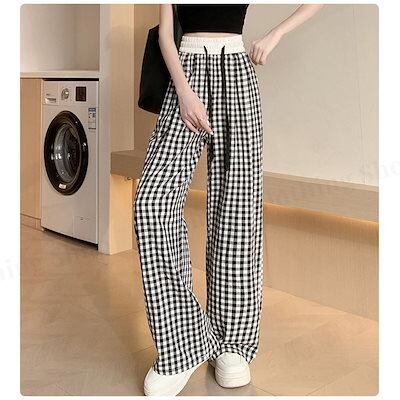 【2枚購入で1oo円OFF!】新作 韓国ファッション 春パンツ レディースチェック柄ワイドパンツ カジュアルゆったりパンツ 薄手 ゆったり ロングパンツ ワイドパンツ リブ カジュアル ボトムス