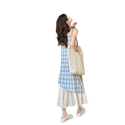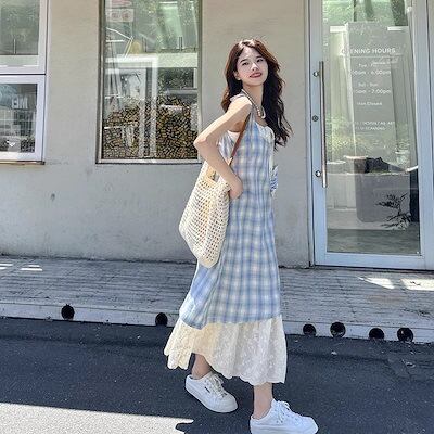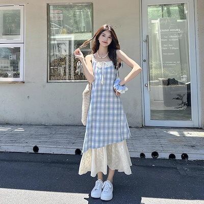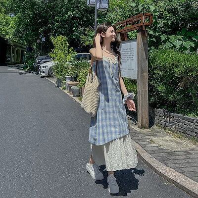 【2枚購入で 2oo円OFF!】 メガ割商品 2025夏 ワンピース 新作 ノースリーブドレス ワンピース レディースフ 通学ロングワンピース キャミワンピ 青い格紋 サスペンダースカート デザイン