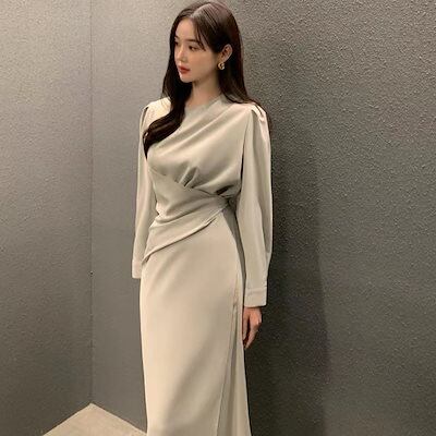 韓国春秋新型フレンチデザインしわ長袖ワンピース女性気質ロング丈ウエストリボンロングスカート
