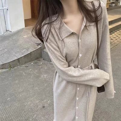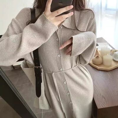 ニットワンピース女性秋の韓国版気質は腰を収めて痩せていて膝を越えて長いタイプのスカートを着ている