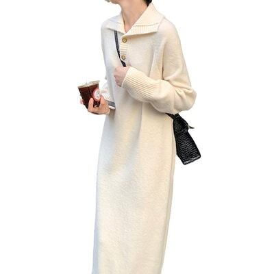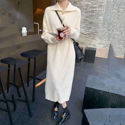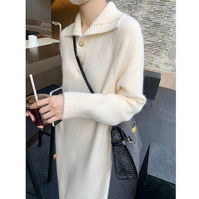 韓国版の新型女性用セーターファッションニットのワンピースボタンの襟がゆったりしています