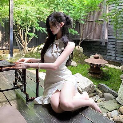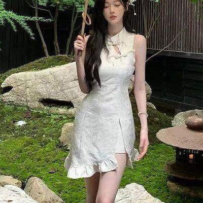 チャイナ風 改良 チャイナドレス ノースリーブ ワンピース 夏新作 修身 ラッフル マーメイドワンピース