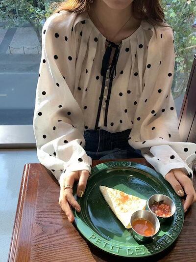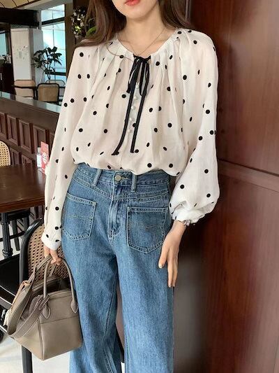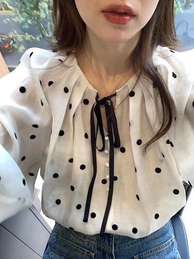 春秋 水玉模様 ランタン袖 設計感ブラウス レディース 韓国ファッション 長袖 薄 シフォンブラウス 可愛い夏 シャツ 百掛け 通勤 トップス 大きいサイズ Tシャツ