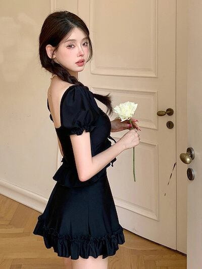 本日水着 ワンピース水着 2点セットビキニ 体型カバー レディース モノキニ ママ水着 体型カバー水着 フリル 黒 無地 シンプル YY9 セットアップ