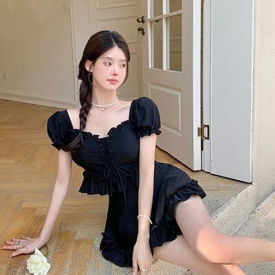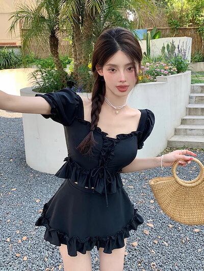 ワンピース水着 体型カバー モノキニ セットアップ 夏 体型カバー水着 無地 2点セットビキニ シンプル レディース 水着 ママ水着 夏新作 YY9 黒 フリル