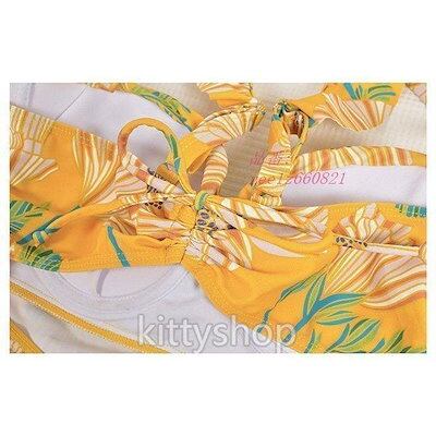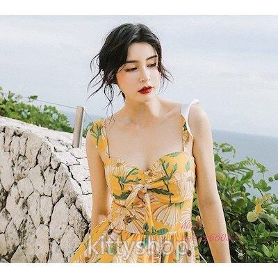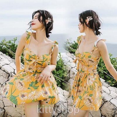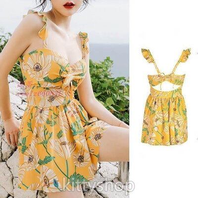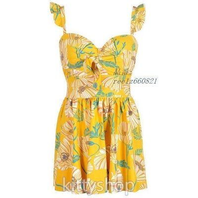 水着レディース20代イエローワンピース水着花柄体型カバー水着水着スカートフリルVネックキャミワンピースタンキニ2点セット可愛い